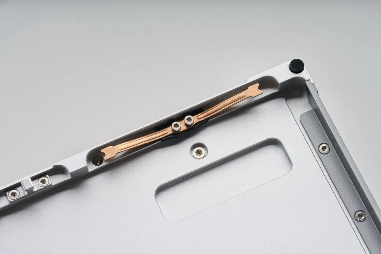일반적인 사양으로는 DP104가 트라이모드 연결성을 지원합니다—블루투스, 2.4 GHz 무선, USB Type‑C 유선—이며, 2.4 GHz와 유선 연결 시 8 kHz 폴링을 제공합니다. 배터리는 놀랍게도 8,000 mAh 용량에 10 W 충전을 지원하고, 색상이 맞춰진 염료 승화 방식의 PBT 키캡은 익숙한 체리 프로파일을 채택했습니다. 출시 시에는 폴리프로필렌(PP) 플레이트만 제공되지만, 수요가 충분히 확보된다면 다른 소재의 플레이트도 곧 선보일 가능성이 있습니다. DP104는 Ticktype이 “듀얼-브리지 Be‑Cu 구조”라고 부르는 방식을 사용합니다. 이는 기본적으로 리프 스프링 마운팅 시스템에 플레이트 위에 고무 가스킷을 추가한 형태로, PCB와 플레이트를 알루미늄 케이스와 분리해 소음 억제 특성을 부여합니다. 또한 플렉스‑컷 PCB를 적용해 어느 정도 쿠션감 있는 타이핑 느낌을 제공합니다.