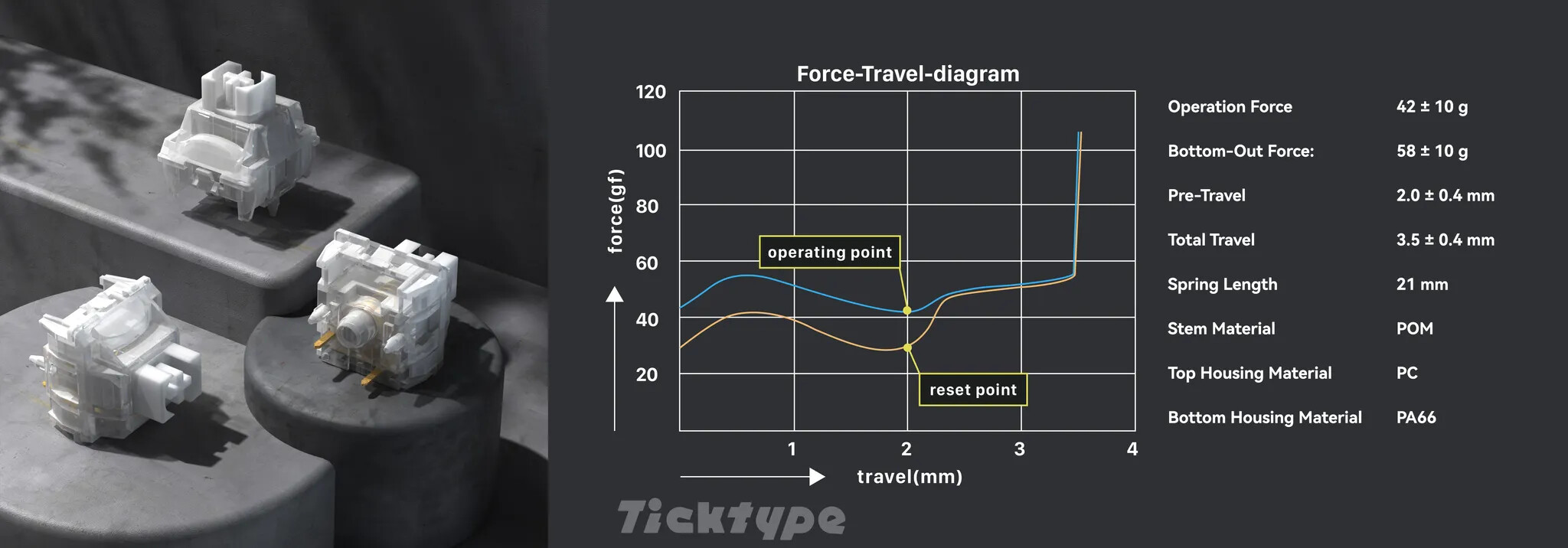 Ticktype DP104는 조립된 키트 형태로 다섯 가지 색상(양극산화 또는 스프레이 코팅) 중 선택할 수 있으며, 두 가지 스위치 옵션을 제공합니다—작동 힘 36‑45 gf·키행 3.6 mm인 Rye Linear 스위치와 작동 힘 42‑58 gf·총 키행 3.5 mm인 Cloud Silent Tactile 스위치. Cloud Silent Tactile 스위치는 Mecha Grey와 Powder White 색상에서만 제공되며, First Light, Cat Paws Pink, Blue Sky 색상은 Linear 스위치 옵션만 제공됩니다. 공식 가격은 아직 발표되지 않았으나, Discord 공지에 따르면 11월 말에 출시될 예정이라고 합니다.