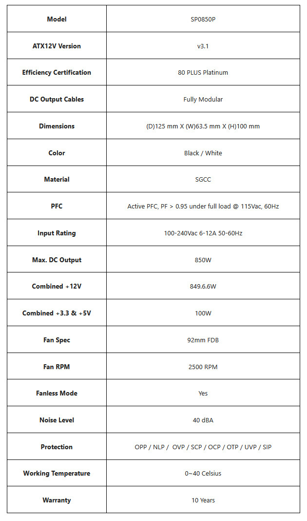 파워 서플라이가 내부 장착되어 후면 AC 접근이 제한된 빌드에서는, IEC 320 C14-to-C13 확장 코드를 제공하여 케이스를 열지 않고도 파워 서플라이의 전원을 끌 수 있습니다. 또한, SP 플래티넘은 92mm FDB 팬을 탑재했으며, 스마트 열 곡선을 적용해 40% 부하 이하에서는 팬이 완전히 정지되어 아이들 노이즈를 제거합니다.
