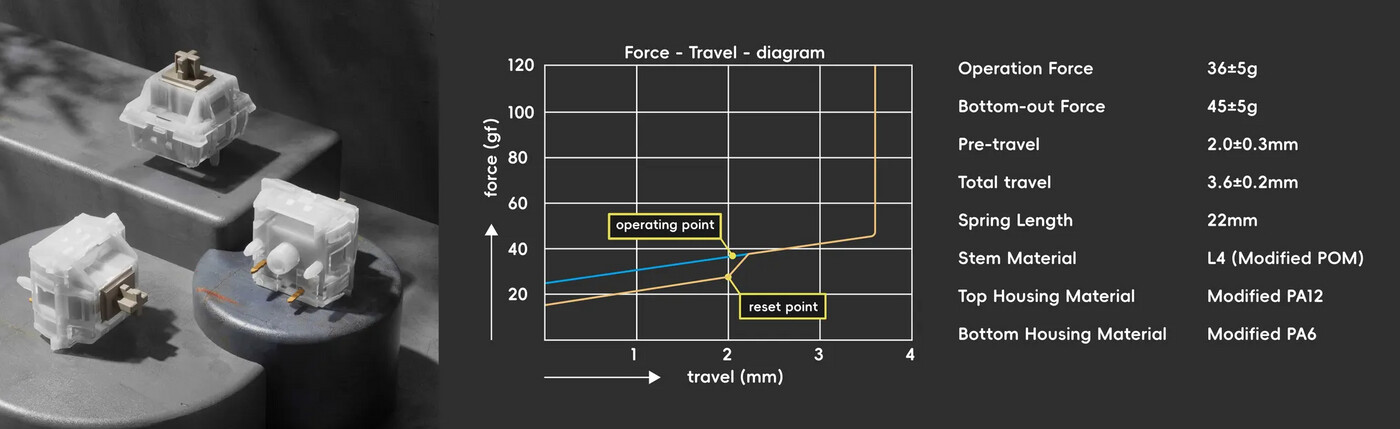 듀얼 3,100 mAh 배터리는 블루투스와 2.4 GHz 연결성 모두에 전원을 공급하지만, Qwertykeys는 배터리 수명에 대해 아무런 주장도 하지 않습니다. 그럼에도 불구하고, 해당 배터리 용량은 QMK 펌웨어를 실행하는 키보드에게도 상당히 큰 편입니다. 섀시는 CNC 알루미늄으로 제작되었으며, 구매자는 6.25u 스페이스 또는 7u 스페이스바 중 하나를 가진 1.2 mm 플렉스 컷 핫스왑 PCB 또는 1.6 mm 논 플렉스 컷 핫스왑 PCB 옵션을 선택할 수 있습니다. ISO 레이아웃은 7u 스페이스바에서만 사용 가능합니다.