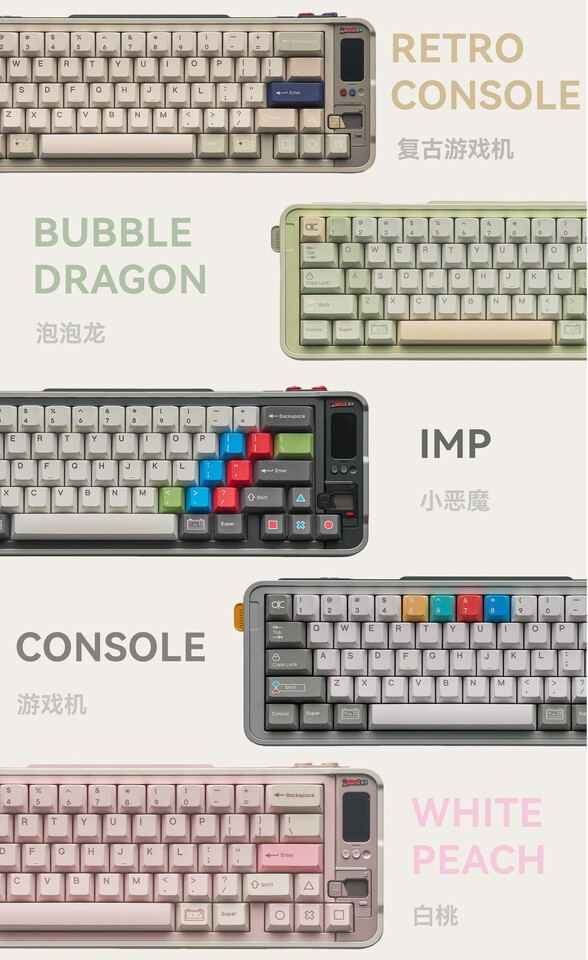QK65 MK3는 65% 기계식 키보드로, 화살표 클러스터는 있지만 F열, 숫자 패드, 심지어 알파 키 오른쪽의 탐색 클러스터도 없음을 의미합니다. 이는 다섯 가지 레트로 스타일 색상—스프레이 코팅된 이클립스 그레이(Eclipse Grey), 레트로 화이트(Retro White), 핑크(Pink), 또는 그린(Green), 그리고 아노다이징된 바살트 그레이(Basalt Grey)—으로 제공되며, 구매자는 알루미늄, 폴리프로필렌, 또는 FR4 플레이트 중에서 선택할 수 있으며, 이는 다양한 타이핑 경험과 사운드 프로파일을 제공할 것입니다. Qwertykeys는 또한 내장 디스플레이의 기능도 공개하였는데, 이는 커스텀 애니메이션을 재생하거나, 시간과 타이핑 입력에 반응하는 애니메이션 고양이 또는 강아지가 있는 화면을 보여주거나, 사용자가 "Animal Supermarket" 타이핑 미니 게임을 플레이할 수 있도록 합니다. 또한 배터리 수명, 연결성 또는 OS 모드, 캡스 록 상태와 같은 시스템 정보를 표시하는 데 사용될 수도 있습니다. 키보드의 오른쪽 상단 가장자리에는 OS 및 연결 모드를 제어하는 두 개의 로우 프로파일 노브가 있습니다. QK65 MK3는 또한 디스플레이 커스터마이징을 가능하게 하도록 조정된 커스텀 VIA 포크에서 완벽하게 커스터마이징이 가능하며, 이는 사용자들이 매크로를 생성하고, 키를 재매핑하며, 키보드의 키별 RGB 백라이트를 커스터마이징할 수 있음을 의미합니다.