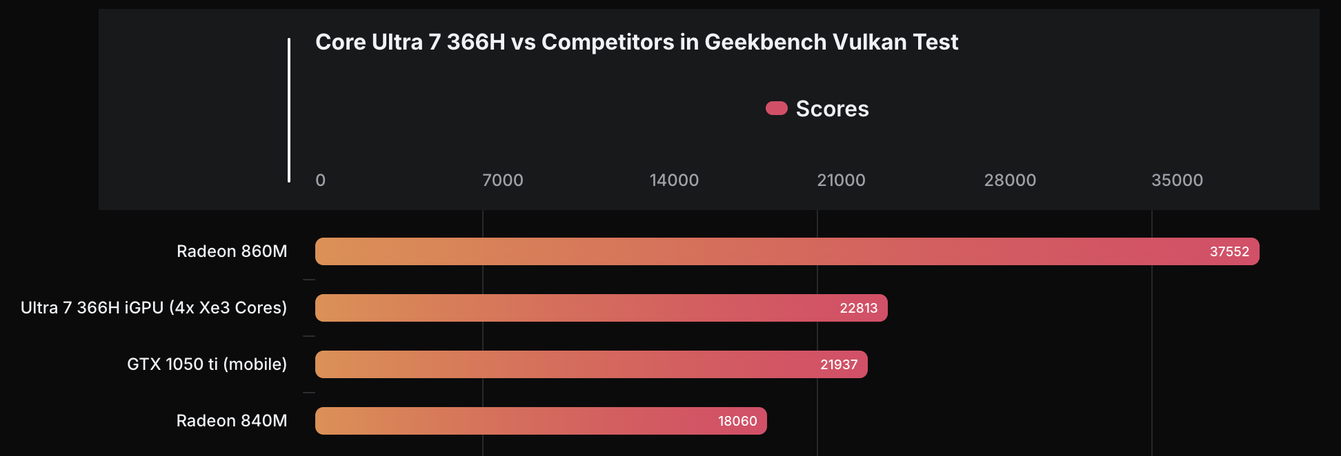 유출/루머 Intel Core Ultra 7 366H 유출 iGPU 긱벤치 벤치마크, Radeon 840M 대비 26% 높은 점수 기록 file 2025.12.04