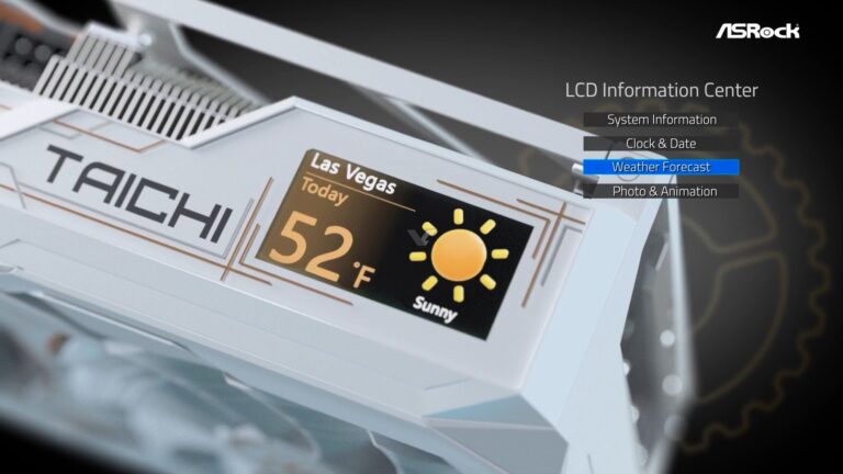 가장 핵심적인 특징인 내장 LCD는 슈라우드에 위치하며, ASRock이 "LCD 인포메이션 센터(LCD Information Center)"라 부르는 기능을 통해 ASRock Polychrome으로 관리됩니다. ASRock에 따르면, 이 LCD는 화이트 PCB 및 확장된 ARGB 조명과 더불어 GPU 상태 정보, 시계 및 날짜, 날씨, 그리고 사진이나 애니메이션 같은 사용자 콘텐츠를 표시할 수 있습니다.