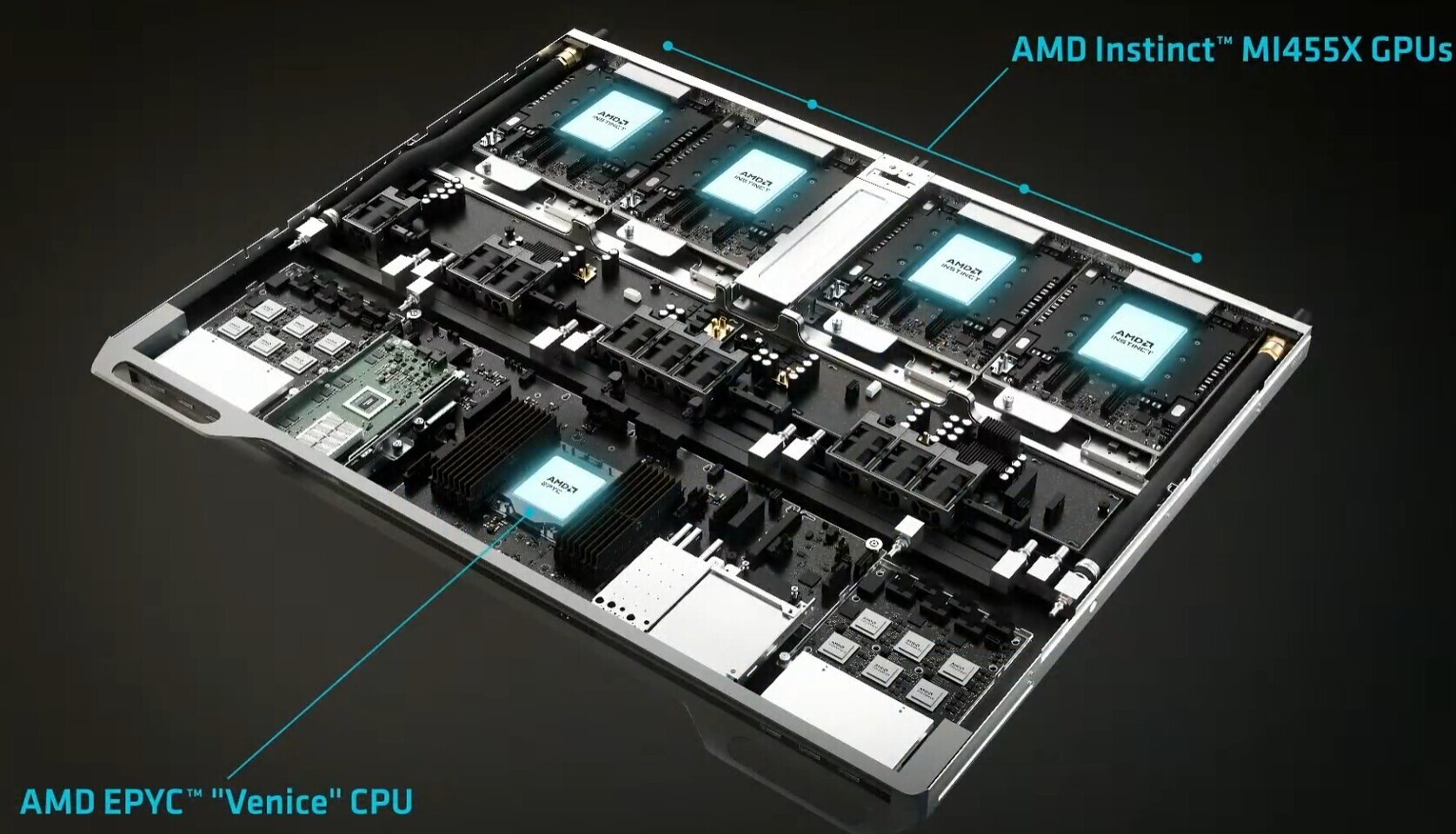 AMD CEO 리사 수 박사는 회사의 2026 국제 CES 행사에서 AMD MI455X AI GPU로 구동되는 2026년형 "Helios" AI 랙을 이끄는 차세대 EPYC "Venice" 엔터프라이즈 프로세서를 들어 보였습니다. 랙의 각 노드는 4개의 MI455X GPU와 256코어/512스레드 구성을 갖춘 1개의 EPYC "Venice" 프로세서를 특징으로 합니다. 이 패키지는 현재의 EPYC 칩과 비교하여 상당히 다른 칩렛 레이아웃을 특징으로 합니다. 이는 4nm 공정으로 제작된 두 개의 얇은 중앙 서버 I/O 다이(sIOD)를 보여주며, 그 양옆에는 각각 2nm 파운드리 공정으로 제작되고 32개의 "Zen 6" 코어를 탑재한 CCD가 최대 8개 배치되어 있습니다.