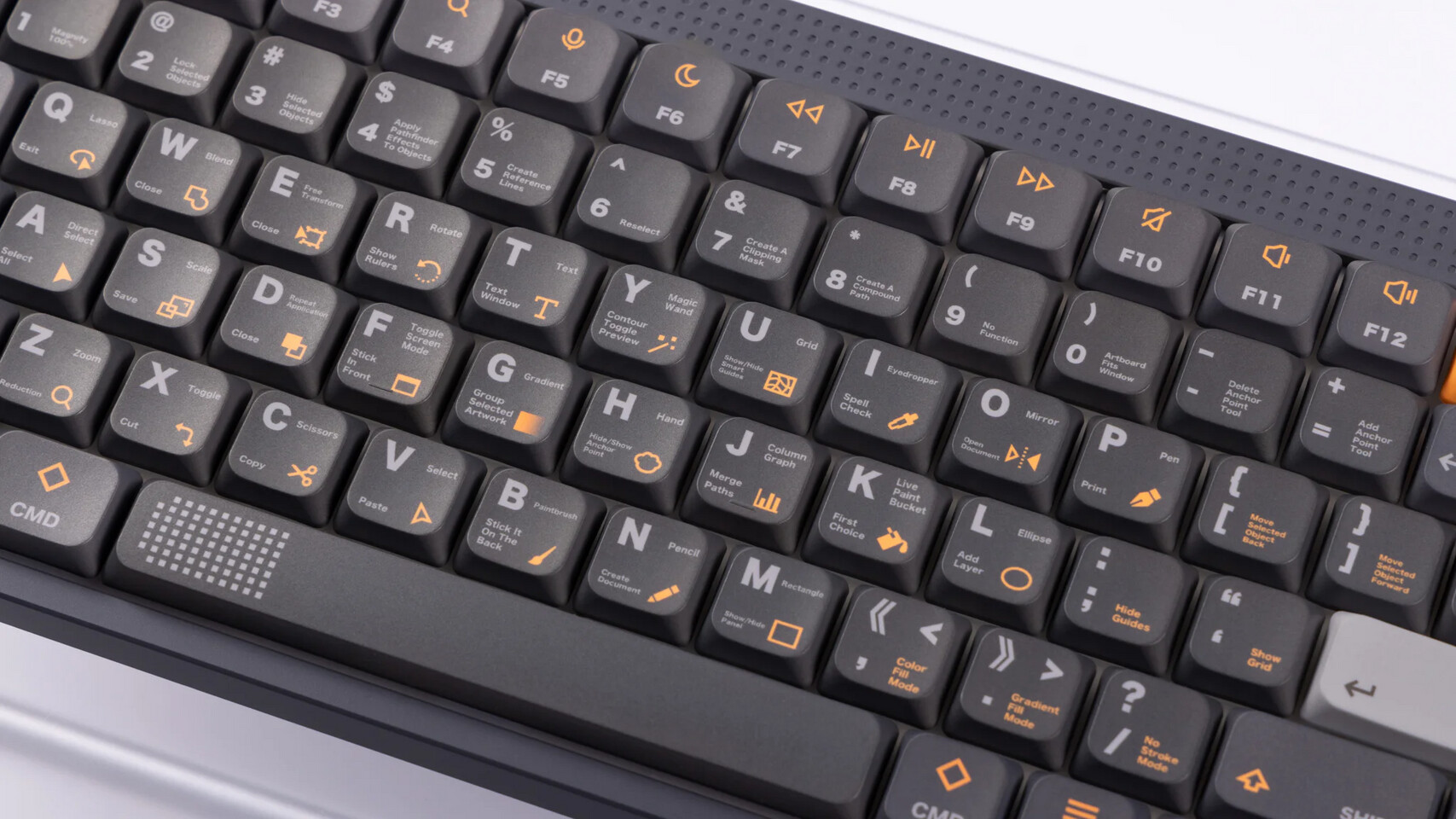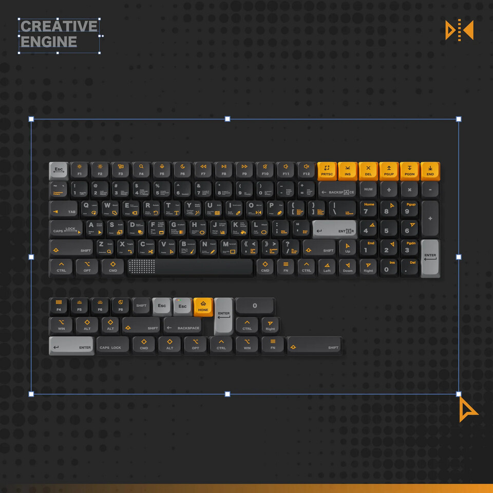 아쿠아리움 키캡 세트와 마찬가지로 크리에이티브 엔진 키캡 세트는 BOHO가 디자인하고 기계식 키보드 분야의 유명 OEM인 키톡(KeyTok)이 제조했습니다. 크리에이티브 엔진 키캡 세트는 어도비 일러스트레이터(Adobe Illustrator)의 UI에서 영감을 얻었으며, 주요 영숫자 키캡에는 세 가지 톤의 회색을, 포인트 키캡에는 밝은 노란색을 사용했습니다. 키캡의 각인은 일러스트레이터 테마를 반영하여, 각 키캡에는 기본 일러스트레이터 단축키를 위한 아이콘과 글자가 승화 전사 방식으로 인쇄되어 있습니다. nSA 프로파일은 5.5mm의 최대 높이와 구형(spherical) 상단면을 특징으로 합니다. 이는 X축으로만 굴곡진 원통형(cylindrical) 상단면을 사용하는 체리(Cherry) 프로파일 등과 달리, 상단면이 X축과 Y축 양방향으로 휘어져 있음을 의미합니다. 누피는 자사의 Air, Kick, Node 시리즈 로우 프로파일 키캡과의 호환성을 명시하고 있지만, 이 키캡들은 MX 스타일 스위치를 사용하고 60%에서 100% 사이의 배열 및 6.25u 스페이스바를 사용하는 모든 기계식 키보드와 호환될 것입니다.