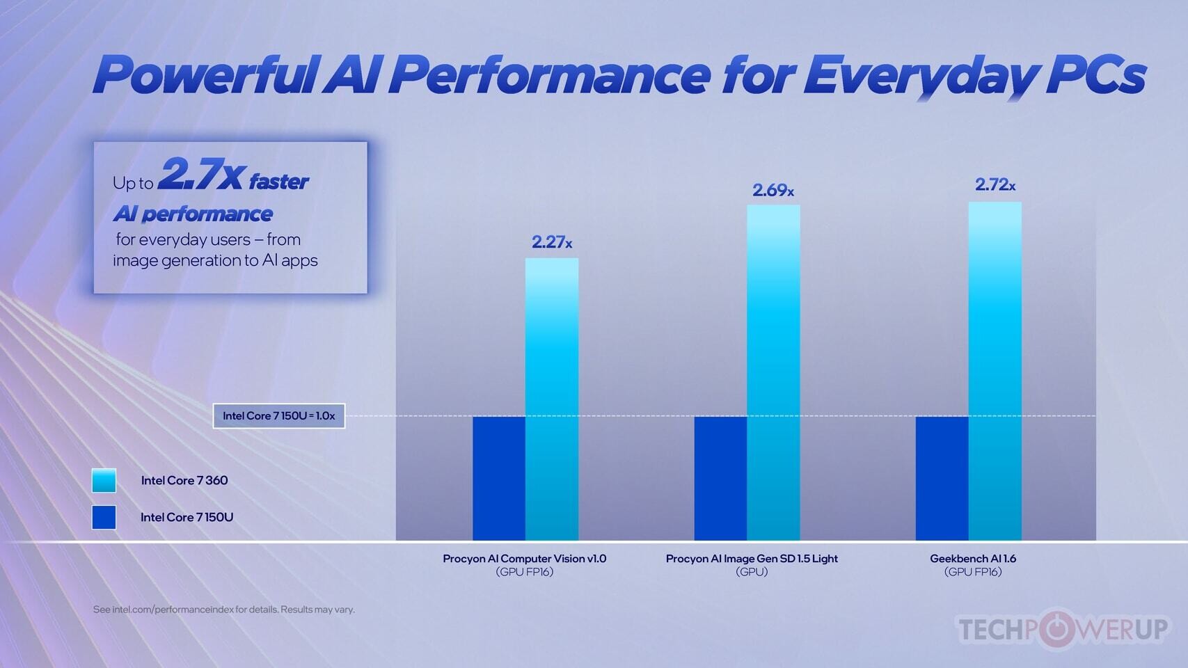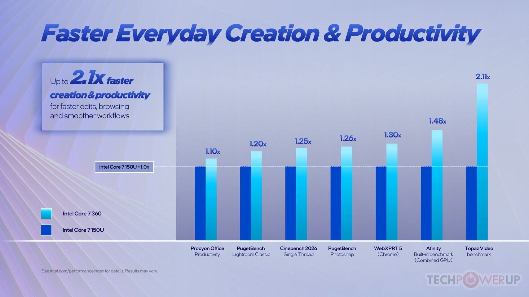 인텔은 이번 "와일드캣 레이크"를 현재 매우 흔하게 사용되는 자사의 두 가지 CPU, 즉 인텔 코어 7 150U "랩터 레이크-U" 및 수년 전 디자인인 코어 i7-1185G7 "타이거 레이크"와 비교했습니다. 인텔이 공략하려는 보급형 세그먼트에서 이러한 세대 간 성능 도약은 상당히 고무적인데, 이는 그동안 효율성과 성능을 새로운 정점으로 끌어올린 수많은 아키텍처 및 제조 공정의 개선이 있었기 때문입니다. 인텔은 약 18.5시간의 넷플릭스 스트리밍, 12.5시간의 사무용 생산성 작업, 그리고 AI 효과를 적용한 상태에서 약 9.6시간의 줌(Zoom) 통화 시간을 보장합니다.