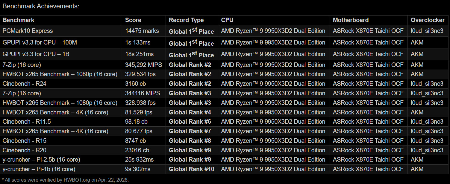 업계동향 ASRock X870E Taichi OCF, AMD 라이젠 9 9950X3D2 Dual Edition 프로세서와 함께 다수의 오버클러킹 기록 달성 **번역본뉴스입니다. 오역이 있을수 있습니다. 메인보드, 그래픽 카드, 미니 PC, 게이밍 모니터, 전원 공급 장치 및 AIO 수냉 쿨러 분야의 ... newfile 2026.04.26